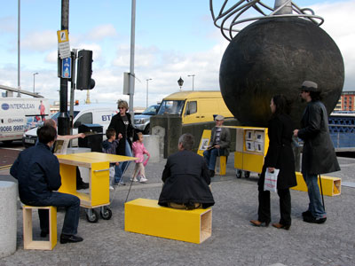 Yellow Space is a project of Belfast-based Building Initiative. Building Initiative aims to reintroduce a politics of place to Belfast by developing public consciousness of built environment issues. Yellow is the colour of consensus, utility, and universal access – exactly those qualities one expects to find and enjoy in cities. The Yellow Box was used to distribute copies of the broadsheet 'Yellow Press' at various locations in Belfast.